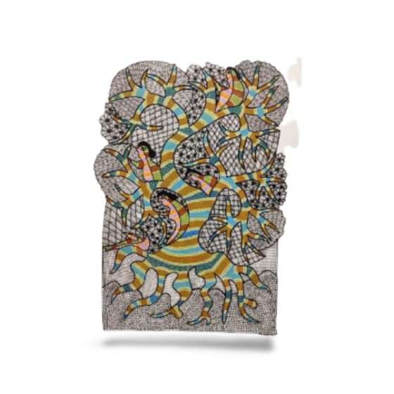 Gond painting is a famous folk art of the Gond tribal community of Central India.The designs are vibrant which include characters of folktales and mythology, flowers, trees, birds and animals, social and cultural norms of Gond people and their lifestyle, Hindu deities, Tribal deities, etc. These characters are filled with various smaller patterns like lines, dots, scales, geometric shapes, abstract curved lines, semi-circles, etc. The uniqueness of this painting has awarded it with "GI Tag".