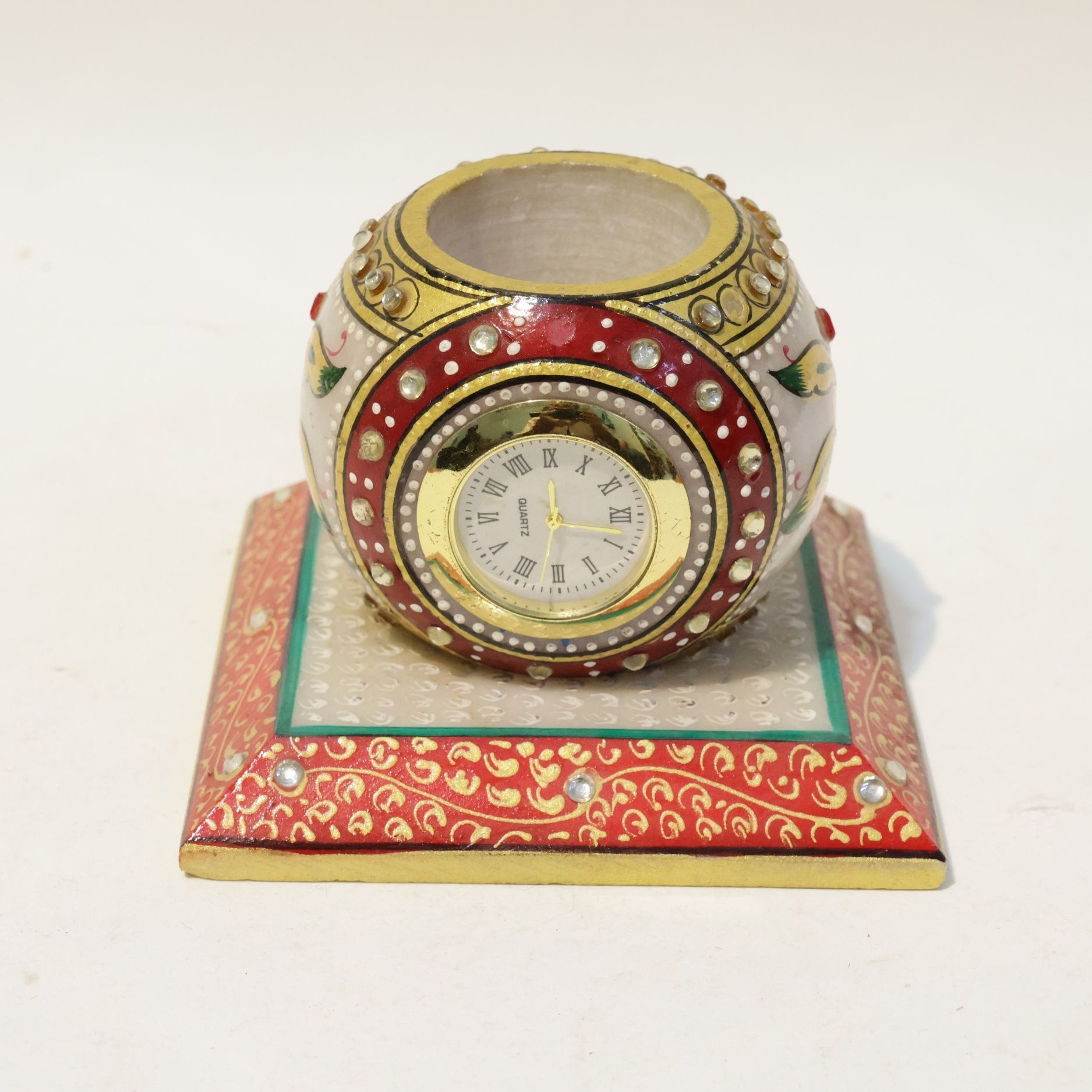 The Saras Aajeevika Presenting Handcrafted White marble pen stand with watch made by Shri Ganeshay Naman SHG of Rajasthan Elegant white marble round-shaped watch with built-in pen stand. A perfect blend of functionality and décor, ideal for desks, offices, or gifting. Handcrafted for a timeless appeal.