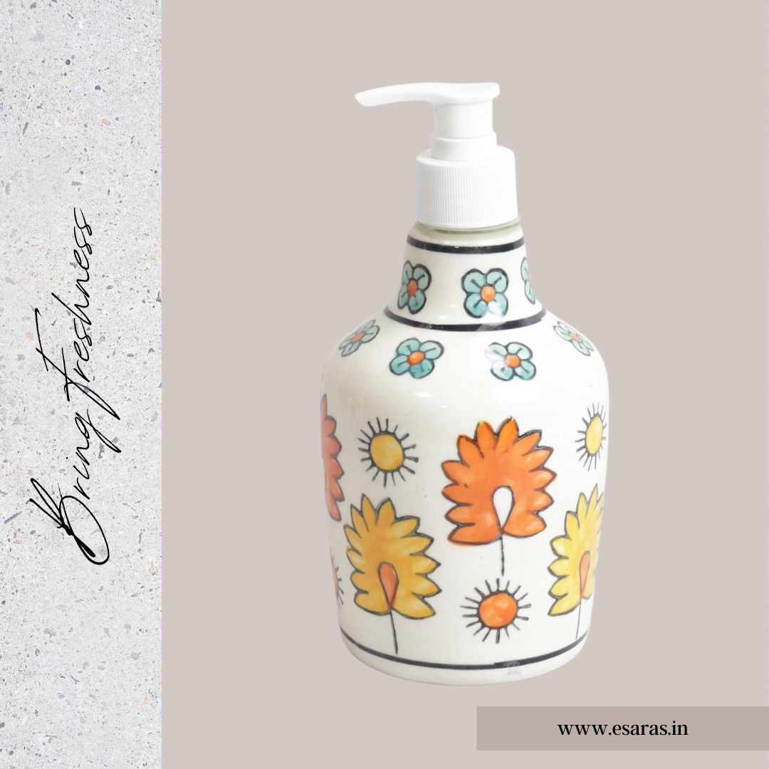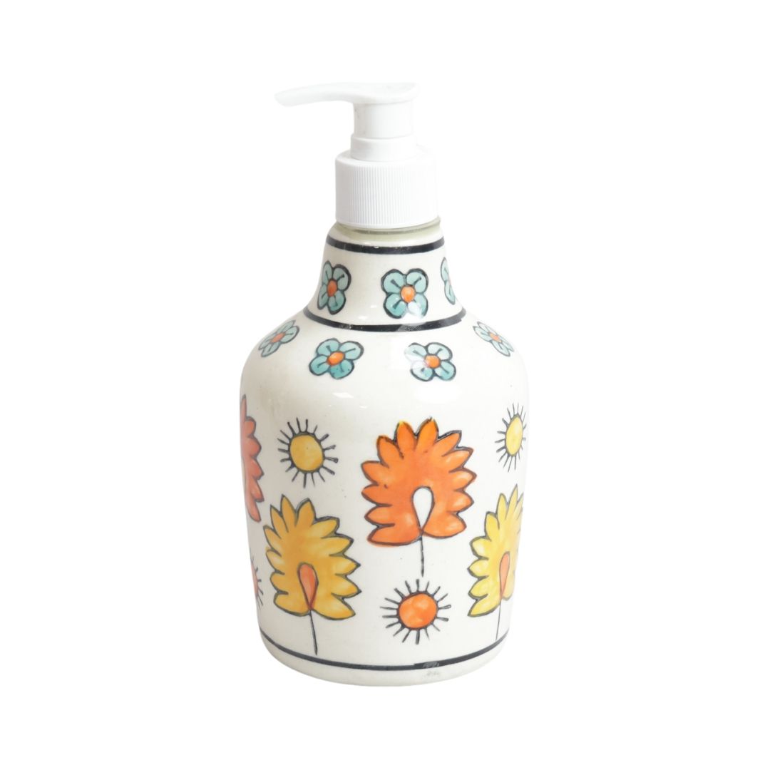 Saras Aajeevika Falak SHG Khurja Pottery Uttar Pradesh Handcrafted Handpainted Glossy Ceramic Soap Dispenser White Colour with Orange & Yellow Flower|Hand Paited Ceramic Liquid Soap Dispenser with Pump| Bathroom Liquid Soap Dispenser |Kitchen Liquid Soap Dispenser|Wash Basin Liquid Soap Dispenser|Shower Gel Dispenser|Handwash Bottle|Refillable soap dispenser with Pump|Pack of 1|380 Grms