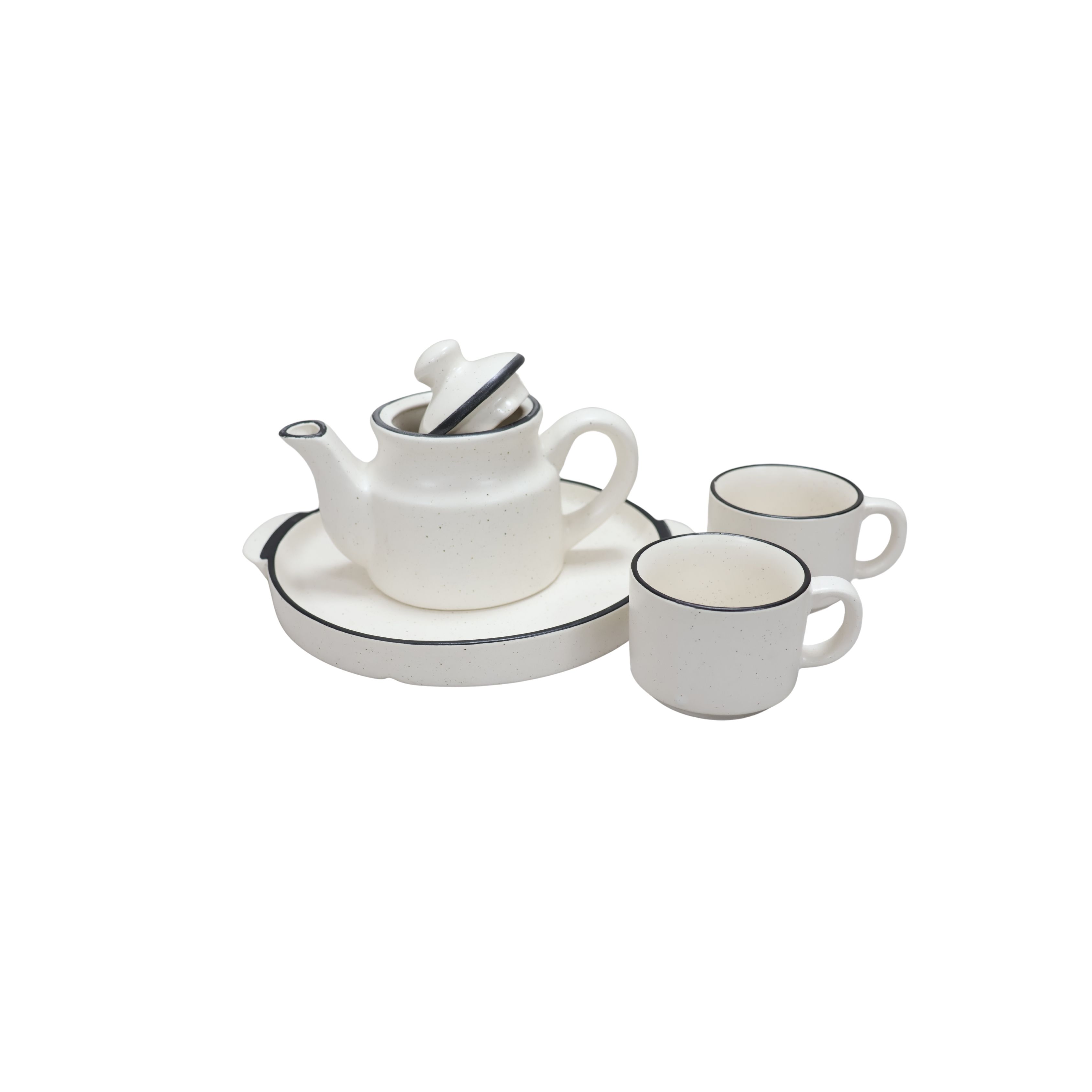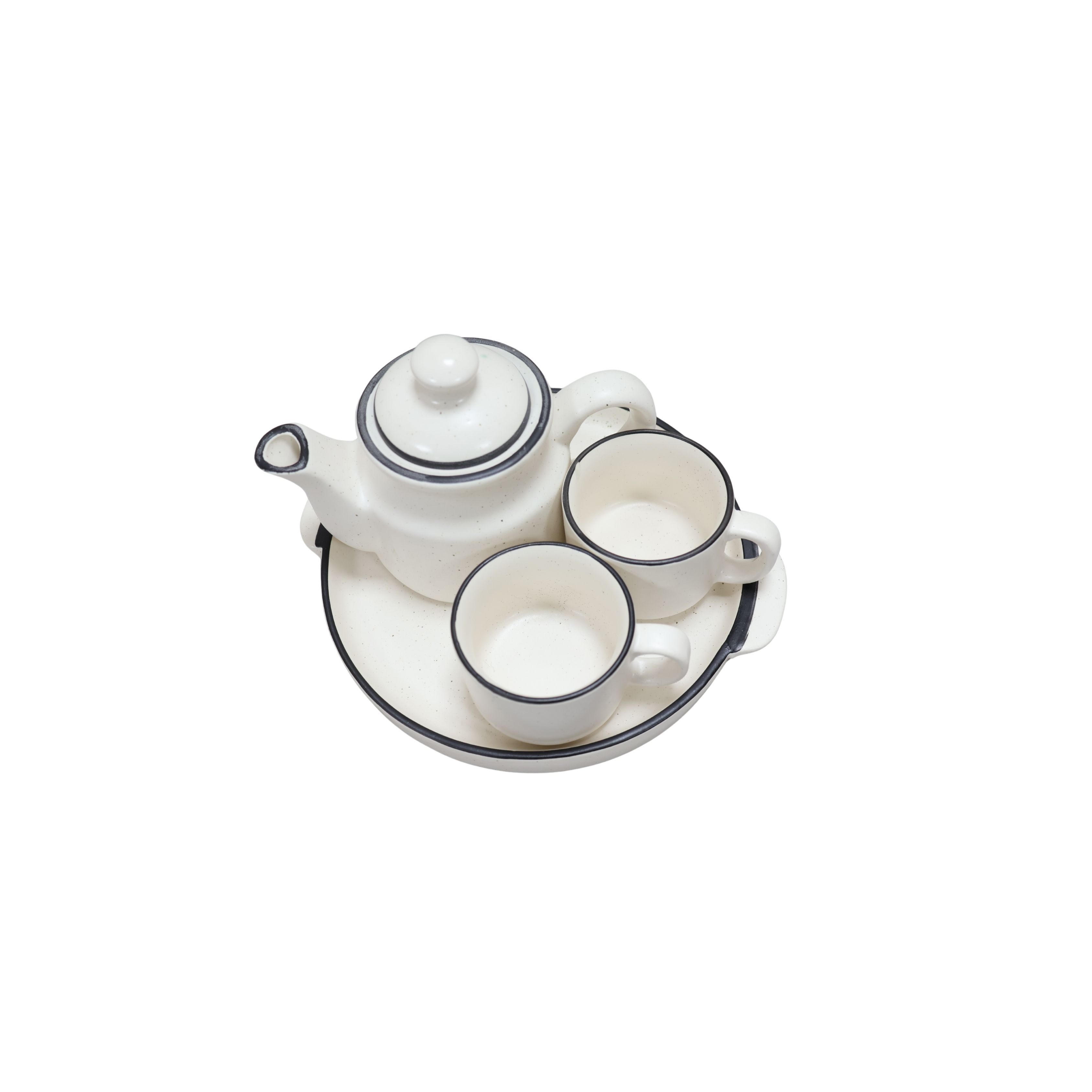 Khurja Pottery Murli Set White Grey Line | Handcrafted Ceramic Murali Tea Set| Teacup Set with Kettle & Serving Tray|Ceramic Tea set|2 Cups