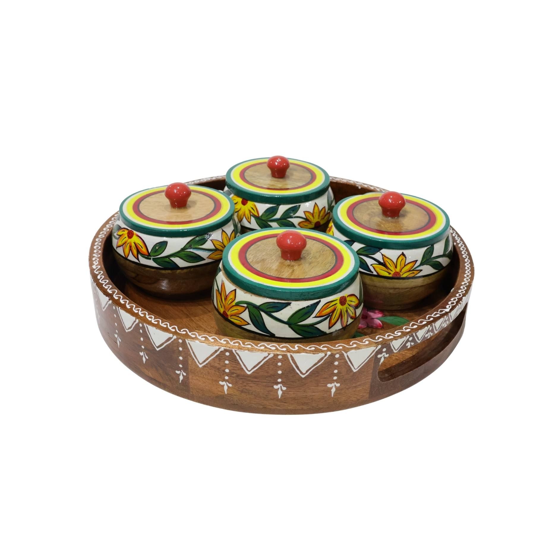 Wooden Round Tray With 4 Barni || Decorative Item for Kitchen || Saras Aajeevika