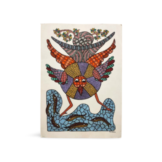 Gond painting is a famous folk art of the Gond tribal community of Central India.The designs are vibrant which include characters of folktales and mythology, flowers, trees, birds and animals, social and cultural norms of Gond people and their lifestyle, Hindu deities, Tribal deities, etc. These characters are filled with various smaller patterns like lines, dots, scales, geometric shapes, abstract curved lines, semi-circles, etc. The uniqueness of this painting has awarded it with "GI Tag".
